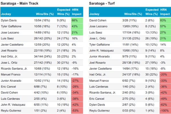 For example, looking at Jose Lezcano on the turf last year, based on the odds of his starters he would be expected to win about eight races, but instead he booted home 13 winners (19 percent), good for an HRN Impact score of +57 percent. This is like betting his horses and expecting to win eight races but getting five more winners. In contrast, Irad Ortiz, Jr.'s horses are extremely well bet, and based on those odds he could have been expected to win 22 percent of his turf races, but instead won only 18 percent. So Lezcano's turf performance was ahead 19 percent to 18 percent, while riding much longer prices. He was the much better bet in 2020.