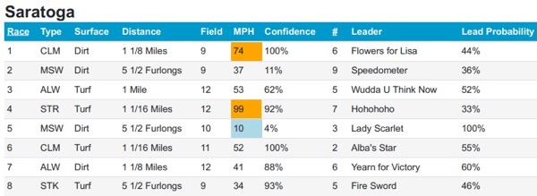 The pace report also identifies the most likely leader for the race and assigns a probability that the horse identified as the leader will indeed get the lead. There is also an overall confidence number, which is based on each horse having two running lines to analyze. The more first-time starters or overseas shippers without running lines, the less confidence in the numbers.