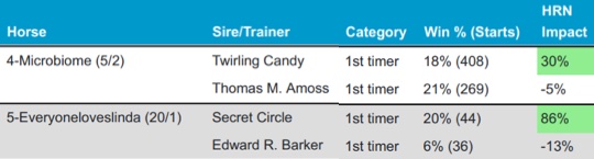 What is unique about this report is the HRN Impact score which is based on all of the starters in that category. For example, we see looking at No. 4 Microbiome in Saratoga race 2 on opening day, that her sire Twirling Candy is 18 percent with first-time starters. But what the HRN impact score of +30 percent says is that Twirling Candy first-time starters are frequently under-bet and are 30 percent overlays. While Twirling Candy firsters are winning at 18 percent, they aren't bet like an 18% first-time sire, so there is potential for an overlay.